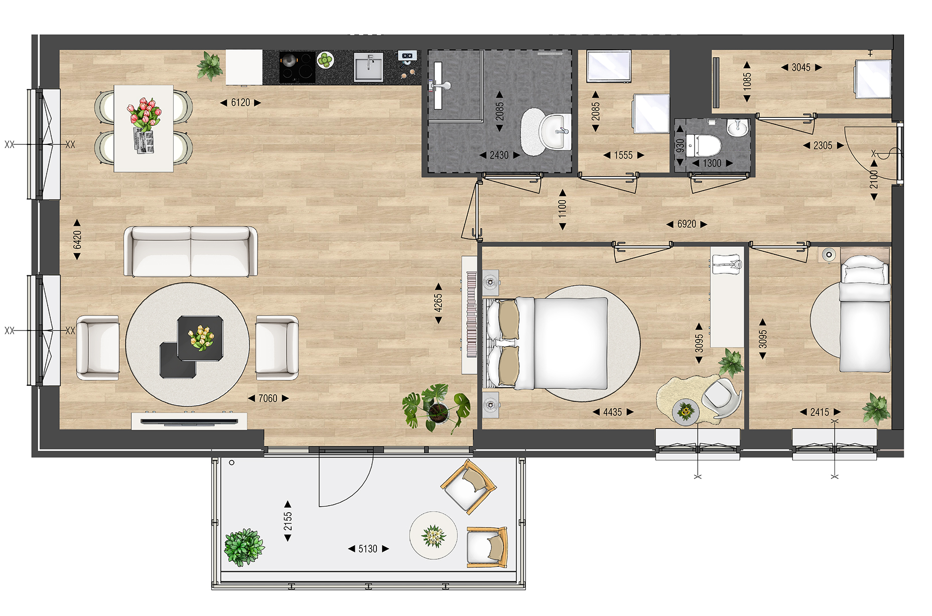 Met 89 m2 aan woonoppervlak heeft u ruimte genoeg en woont u hier straks heerlijk. Naast een ruime woonkamer met open keuken geniet u van twee slaapkamers, een badkamer met hoogwaardig sanitair en verfijnd tegelwerk en een separaat toilet. De Franse balkons zorgen voor extra lichtinval in uw appartement.