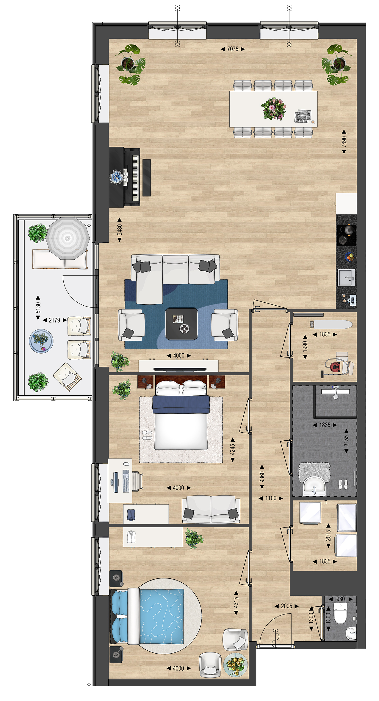 Geniet van het buitenleven op een royaal balkon van 36 m² (type E1), of een fijn balkon van ca. 10,5 m² (type E2) – hier is het heerlijk vertoeven.